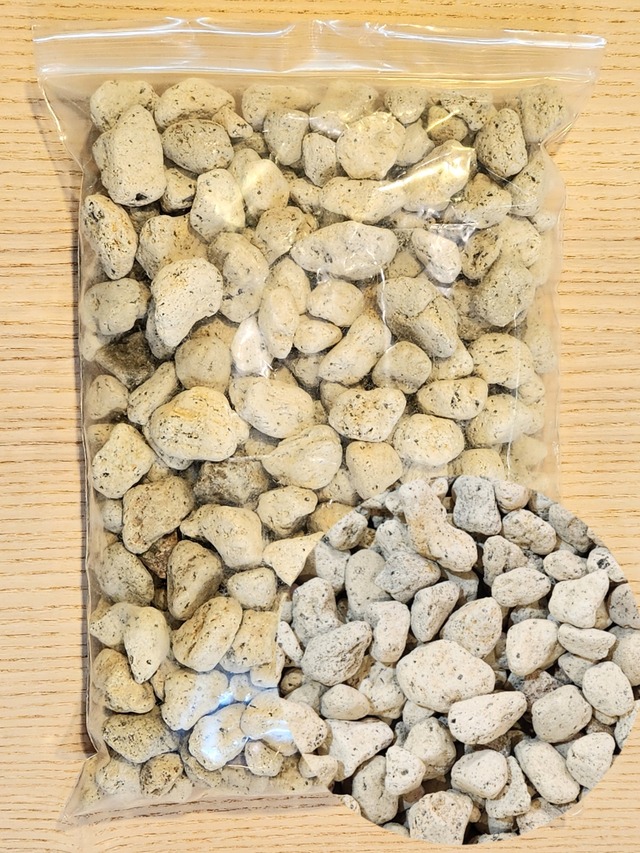 【配送サイズ:一般配送】 植物を植え替え時に鉢底石としてお使いいただける中粒サイズの軽石です。 ボタニカルソイルだけでも鉢底ネットがあれば問題なく植えられますが、 鉢のサイズが大きい場合は、鉢底石を入れることで鉢の中の通気性、排水性がよりよくなります。 ソイルの流失を防ぎますますので、鉢底ネットがない場合にもおすすめです。
